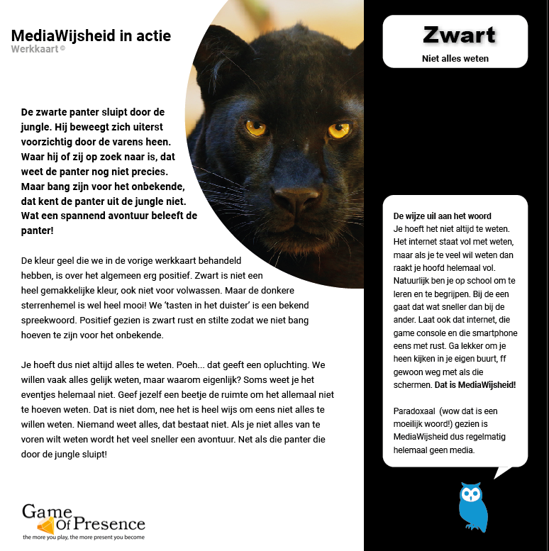 De werkkaarten verwijzen naar twaalf verschillende aspecten van ons zijn. Het is aanwezigheid maar dan ingekleurd. Een voorbeeld is nieuwsgierigheid, openheid, humor en lichtheid. Dat is verbonden met de kleur geel. En de panter staat voor innerlijke rust en niet alles hoeven weten.